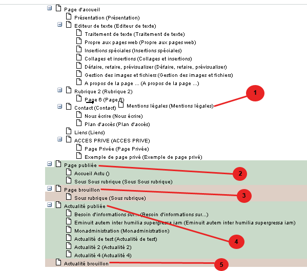 2. La rubrique "Page publiée" représente les pages publiées mais non-visibles dans le sommaire, c'est à dire accessibles par un lien par exemple. Pour qu'elles soient visibles dans le sommaire, il vous suffit de la déplacer au sein de votre arborescence dans la partie blanche.