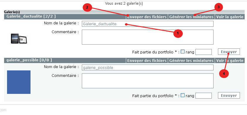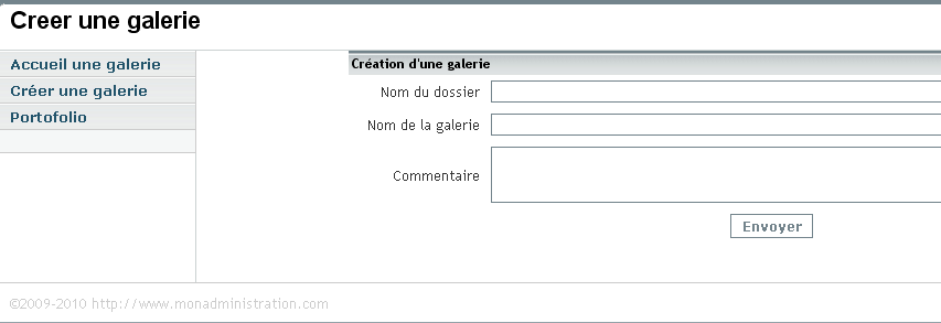 Vous pouvez créer une galerie. Ajoutez un nom au dossier, le nom de votre galerie et cliquez sur "Envoyer". Vous pourrez y ajouter des photos en retournant dans vos galeries photos et suivant les indications de l'explication suivante.