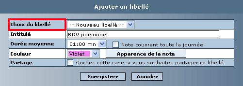 Entrez un intitulé (ex : RDV personnel) suivi de sa durée moyenne (ex : 01:00 mn)