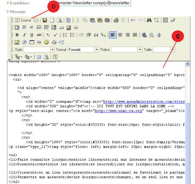 c. Collez le code HTML que vous avez copié précédemment - Voir la rubrique "Préparation d'une newsletter".