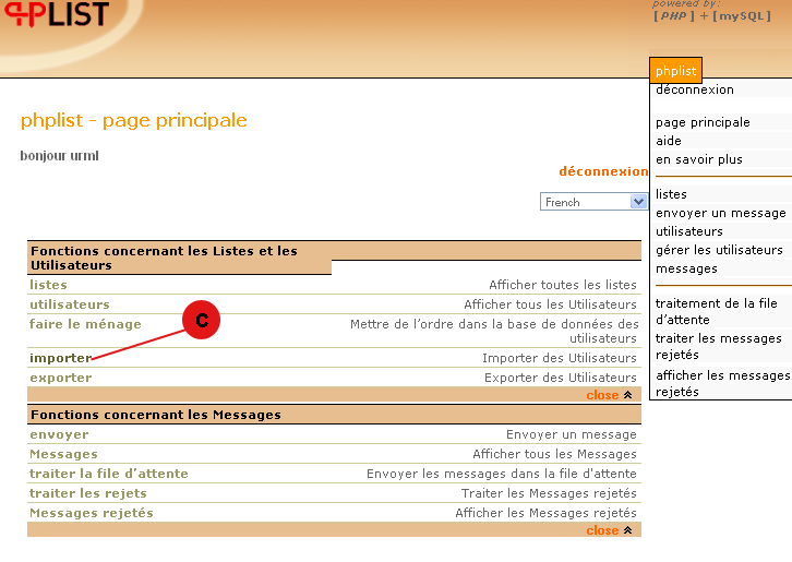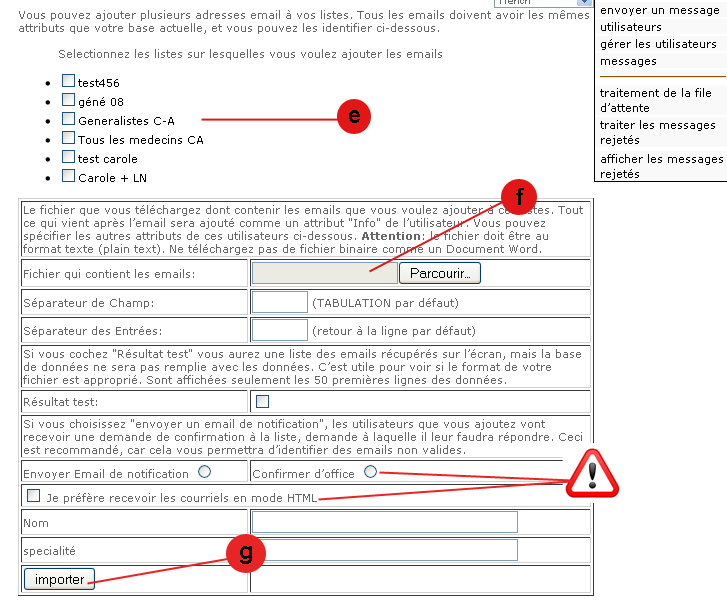 Dans la page principale, cliquez sur "Importer" pour importer des utilisateurs (adresses mail)